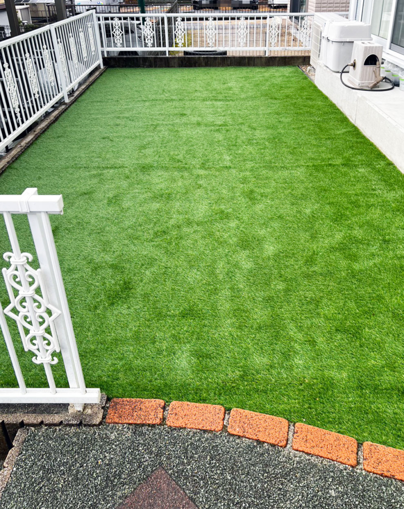 防草処理をしたあと、人工芝施工を行い、スロープ、立水栓も施工しています。 また、倉庫の設置もご依頼いただきました。 是非、他の工事と合わせてごらんください。